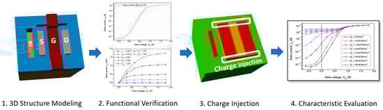 The damage characteristics of the TID effect can be determined via irradiation experiments by designing a circuit and fabricating it into a chip. However, the process of conducting an irradiation experiment after circuit design and chip fabrication is expensive and time consuming, and radiation safety hazards are possible. In contrast, if the TID effects in semiconductors are modeled and simulated using software, the damage characteristics can be efficiently assessed without requiring extensive experimental testing. Consequently, the damage characteristics of the TID effect in the V-gate n-MOSFET-based CMOS logic circuit were evaluated using a TCAD tool. Furthermore, it was modeled according to the procedure shown in Figure 2, and the simulation results were analyzed.