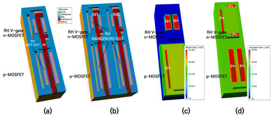 Three-dimensional structural modeling of a V-gate n-MOSFET-based RH CMOS logic circuit. (a) NOT gate, (b) NAND(NOR) gate, (c) donor concentration, and (d) acceptor concentration.