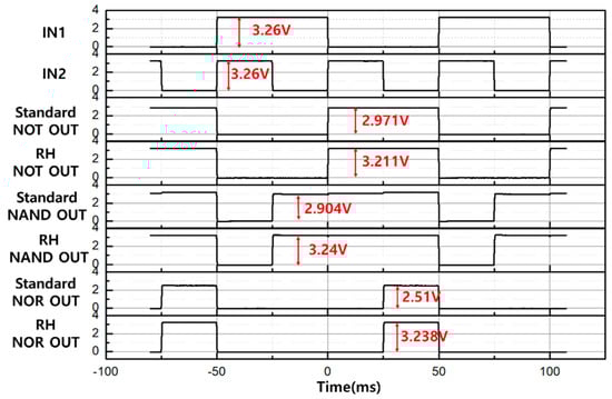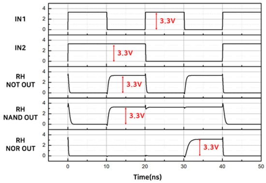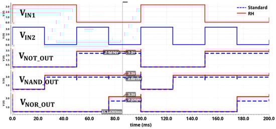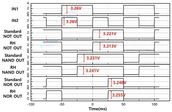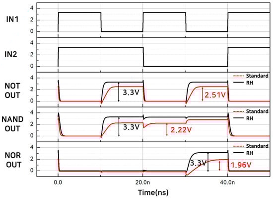 The damage characteristics owing to the TID effect of the standard and RH CMOS logic circuits were validated through circuit simulations, as shown in Figure 6. In the simulation, the standard CMOS NOT gate output of logic “1” decreased from 3.3 V to 2.51 V, the NAND gate decreased from 3.3 V to 2.22 V, and the NOR gate decreased from 3.3 V to 1.96 V, owing to the TID effect. However, unlike the standard CMOS logic circuit, the RH CMOS logic circuit was validated to have radiation resistance characteristics that showed the same results as those before the damage.