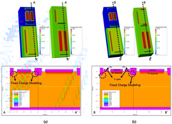 To validate the functioning of the 3D-modeled RH CMOS logic circuit, the operating characteristics were checked with respect to time through a circuit simulation, as shown in Figure 4. For the NOT gate, an inverted output was obtained according to the input pulse. In the case of the NAND gate, logic “0” was output when the two inputs were high. In the case of the NOR gate, logic “1” was output when the two inputs were low. The RH CMOS logic circuit, which was modeled and validated for the operating characteristics, was compared and analyzed with a standard CMOS logic circuit to validate its effect on TID. Figure 5 shows the modeling of the fixed charge generated in the oxide layer of each n-MOSFET by the TID effect using the cutoff depth method [20]. The modeling of the TID effect of the standard CMOS logic circuit and RH CMOS logic are shown in Figure 5a,b, respectively. A-A′ and B-B′ show respective cross-sectional views. Currently, the doping concentration of the fixed charge injected into the oxide is 3 × 1018/cm3.