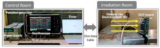 Subsequently, an irradiation experiment was conducted to validate the TID effect in an actual radiation environment. The TID effect test was conducted at a high-level radiation facility at the Advanced Radiation Research Institute of Korea. Figure 11 shows the irradiation test setup. The test was divided into a control room that applied voltage to the DUT and measured the result through an oscilloscope, and an irradiation room that irradiated the cumulative dose to the test sample through a radiation source. For the irradiation test conditions, the dose was set to 5 kGy/h per hour, the total cumulative dose was set to 25 kGy, and the electrical data were measured by applying sinusoidal waves (0–3.3 V) to the input terminals IN1 and IN2 at different frequencies.