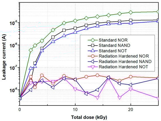 The experimental results are shown in Figure 12. After irradiation, the peak voltage of the standard CMOS NOT gate decreased from 3.221 V to 2.97 1 V, the NAND gate decreased from 3.231 V to 2.904 V, and the NOR gate decreased from 3.246 V to 2.51 V. This confirms that the radiation damage was caused by voltage drops of approximately 0.25, 0.33, and 0.74 V for the NOT, NAND, and NOR gates, respectively. In contrast, the peak voltage of the RH CMOS NOT, NAND, and NOR gates using the RH V-gate n-MOSFET ranged from 3.213 V to 3.211 V, 3.241 V to 3.24 V, and 3.255 V to 3.238 V, respectively, with a small voltage drop. In other words, the radiation resistance characteristics were validated. Additionally, as shown in Figure 13, when the leakage current was extracted, the general CMOS NOT, NAND, and NOR gates were approximately 11.52 µA, 13.05 µA, and 21.69 µA, respectively. In contrast, the leakage currents of the RH CMOS logic circuits were nearly unaffected by radiation damage, measuring approximately 10 nA, 34 nA, and 42 nA, respectively, in the order of tens of nanoamperes.
