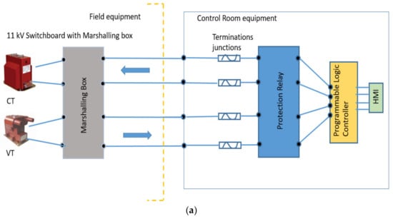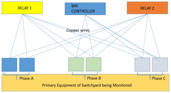 Some form of communication protocol is required in the utilities, mining and resource industries for effective communication between field devices and HMIs. Conventional substation protocols have been used for years by industries, but due to the significant increase in renewable energy sources, the green energy revolution and the availability of smarter technologies, conventional protocols that involve multiple copper wires connecting multivendor devices, as shown in Figure 3, are likely to become obsolete soon. As discussed above, such copper wires make fault finding difficult, insecure, and time-consuming. In the case of the CT secondary becoming open, it could lead to CT saturation and catastrophic failure [].
