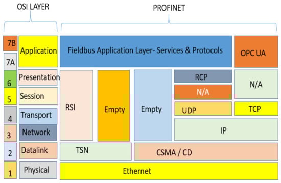 This protocol follows the IEC 61784-2 standard, which encompasses conformance class A, B, C and D versions of protocols. The PROFINET network includes an IO controller/network/device that works on PLCs to address safety, availability, and security in the processing system. It is a suitable device where redundancy in process automation is required to provide media redundancy with switching times of less than 50 ms. It works well within the High-Speed Seamless Redundancy (HSR) topology. PROFINET has a device driver called PROFI drive that was developed in the 1990s by the PROFIBUS and PROFINET joint venture and covers the simplest to the most complex device drives. Using this drive, users can link up various devices in the process automation network and check the level, temperature, flow rate, valves, and actuators. It uses error and failure mechanisms leveraging consecutive numbering, timeout monitoring, and source and destination authentication. Figure 5 shows the interface of PROFINET devices at different OSI layers, which are broken down into data links and physical layers 1–2 []. The network and presentation levels are from 3 to 6 OSI layers, while layer 7 represents the application layer.
