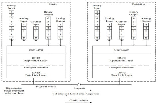 Figure 6 exhibits a master layer on the left-hand side that initiates a data transfer lever on the application layer. The outstation layer on the right-hand side is installed with a data link layer that receives octets from the physical layer and scans them for errors. All error-free octets are then passed on to the application layer within the outstation layer. The outstation layer further transmits the octet back to the master layer to close the loop [].
