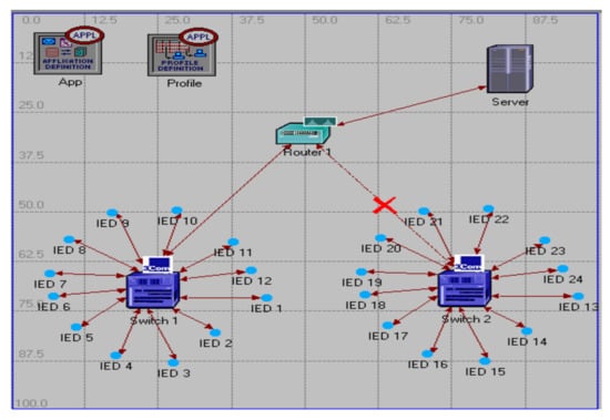 OPNET modelling can analyze almost all scenarios in data transmission and subscription exhibiting traffic queuing, End-To-End (ETE) delay and average delay. It also provides an accurate estimation of a real-life digital SAS scenario involving routers, switches, and IEDs. Figure 15 exhibits typical modelling of a tree network using the OPNET library that comprises switches and various IEDs. In this model, the IEDs are connected in a star topology to two switches. By running the application, one could estimate the ETE and average delays.
