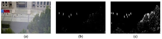 The frame difference method based on temporal information is widely used for the extraction of foreground regions of moving objects from stationary video sequences, owing to its simple, fast, and easy-to-implement computation. However, this method is sensitive to movements such as the shaking of tree branches and leaves, and generally has adjacent frames that show similar or consistent distribution, which would easily result in “holes” and false detections of objects in the frame difference results [17,21], as shown in Figure 1b. Although researchers subsequently made some improvements to the frame difference method, such as the adjacent three frame difference method [14], and the adaptive threshold frame difference method [19,20], these improved methods still cannot effectively reduce the “holes” and false detections of objects.