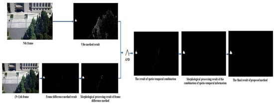 The specific steps of using the spatio-temporal information complementarity and morphological processing operations proposed in the method of this paper are clearly shown in the following processing flow chart of Figure 2.