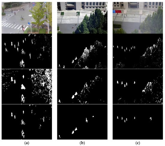The process of extracting the foreground region of the moving objects combined with spatio-temporal information. (a) The results of spatio-temporal combination of a2 sequences; (b) scene_a_0000000 sequence spatio-temporal combination results; (c) scene_a_0020000 sequence spatio-temporal combination results.