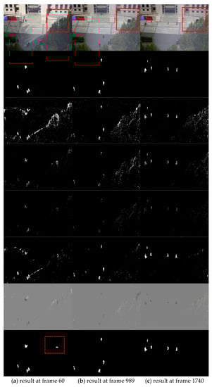 In order to better illustrate the existing mainstream methods, Figure 1 shows the processing effects in shaking areas of tree branches and leaves by respectively using the frame difference methods based on temporal information [14,15,16] and the visual background extractor (VIBE) methods based on spatial information [25], as specifically shown.