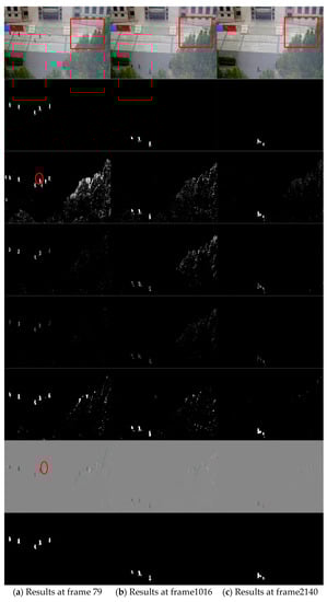 The method proposed in this paper can effectively extract the foreground area of the moving object, without using the scene and weather information [3,28,29,30], whereas the current background subtraction method based on deep learning requires labeling data under different scenes and weather for model training, so as to improve the generalization ability of the model [3,28,29,30,31,32]. Therefore, considering the significant difference between the proposed method and the background subtraction method based on deep learning, we feel that there is no need to make comparison between them; instead, we chose to evaluate our proposed method by comparison with the traditional method having the superior performance.