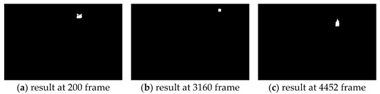 Figure 3 shows a video sequence in the DML dataset [37]. From the visual effect, it can be seen that the morphological dilation fills the “holes” in the frame difference results to a certain extent but enlarges the background noise to a certain extent. Then the AND operation is performed between the VIBE result and the morphological-dilated frame difference result to obtain the final extraction result of the foreground region, which is shown in Formula (4):
