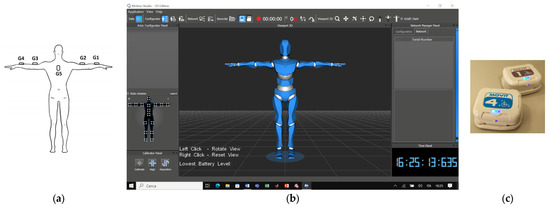 (a) The IMU sensors, termed Movit, labeled from G1 to G5, as seen on the back of the subject’s body; (b) a screen of Motion Studio Software version 2.4 (capable to manage 16 IMUs at once) used for data acquisition; and (c) two Movit G1 units.