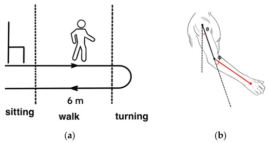 (a) Scheme of the Timed Up and Go (TUG) test and its sub-phases; (b) arm and forearm as a double pendulum system.