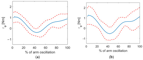 Figure 4a,b show the mean torque τφ values as obtained during a single complete oscillation of the forearm (starting when in maximum flexion) with the method previously detailed (Equation (8)), for both HC and PD groups, respectively.
