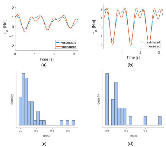 Torques measured (orange solid line) and estimated with β coefficients (blue dashed line) for (a) HC and (b) PD subjects. Distribution of RMSE in (c) HC and (d) PD groups.