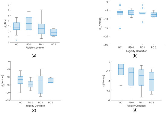 Figure 6 presents boxplots illustrating the β values under various rigidity conditions. Here, we define as “positive” the torque that induces a counterclockwise rotation around the shoulder’s mediolateral axis, i.e., a forward oscillation of the arm. Consequently, we observe that β0, representing the constant force associated with muscle activity, is positive. On the other hand, β1, β2, and β3 exhibit negative values as they contribute to the generation of restoring forces, which act in opposition to changes in joint angles.