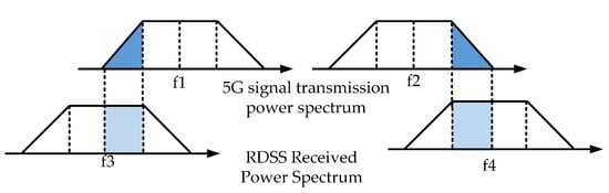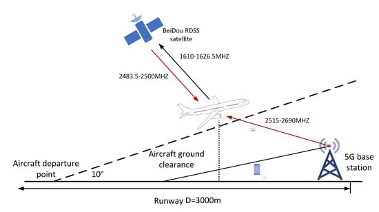 The Beidou Radio Determination Satellite Service (RDSS) provides users with fast positioning, position reporting and short message communication services []. When the Beidou RDSS system is used for flight tracking, it can monitor and track an aircraft’s position and status in the air, and use its short message function to send information such as the aircraft’s current position, flight altitude and speed to the ground monitoring centre. If the flight deviates from the route or other unexpected situations occur, the airline staff can obtain relevant information in time and take necessary measures to improve flight safety and efficiency [,]. Beidou RDSS uplinks are located in the L-band (1559–610 MHz); downlinks are located in the S-band (2483.5–2500 MHz). According to 3GPP R16 TS38.104 [], 5G is divided into two main frequency bands: FR1 (410–7125 MHz) and FR2 (24,250–52,600 MHz), of which the 5G band allocated to China Mobile is 2515 MHz. In addition, due to the ionosphere and the long distance of space transmission [,], the landing power of Beidou signals is around −160 dBW, which makes it somewhat vulnerable.redAs the Beidou RDSS system has not yet been used with 5G systems during the initial frequency design, the impact of 5G out-of-band spurious emission on the Beidou RDSS had not been taken into account. Consequently, the terrestrial 5G network could have an impact on the delicate Beidou system’s performance. This might lead, in severe cases, to malfunctioning of the RDSS system receiver. Therefore, the electromagnetic compatibility of the two systems will become an important factor of influence affecting the safe operation of civil aircraft. A diagram of the interference between the two systems’ adjacent frequencies is shown in Figure 1. The upper spectrum represents the transmitter power spectrum of the 5G signal whereas the lower spectrum shows the power spectrum of the RDSS receiver adjacent to it, where f indicates the center frequency of the receiver or transmitter. Moreover, the blue part represents the spurious radiation region of the 5G signal; if it falls within the main flap range of the receiver power spectrum, both the interfering signal and the useful signal will be detected by the receiver at the same time; thus, generating adjacent frequency interference.