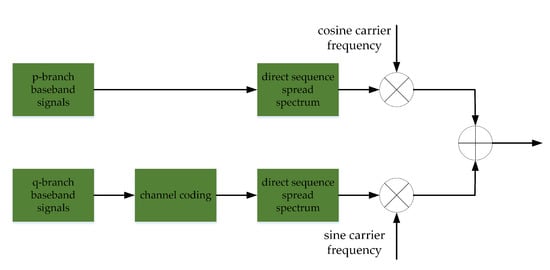 where A represents the amplitude, is the spreading code, indicates the navigation message, presents the initial phase, and is the signal carrier frequency. Based on Equation (1), a block diagram of RDSS signal modulation is given in Figure 2.