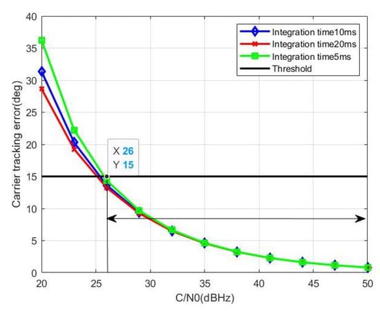 represents the phase-locked loop noise bandwidth; T indicates the pre-detected integration time; is the carrier-to-noise ratio; represents the vibration-induced oscillator jitter and indicates the Allan variance induced oscillator jitter. In practice, the source of PLL flutter may be transient, and only carrier-tracking errors, caused by thermal noise are generally considered. Figure 3 shows the carrier-tracking error plot versus the equivalent carrier-to-noise ratio for different pre-detection integration times where the receiver carrier loop noise bandwidth is constant and equal to 20 Hz. The longer the pre-detection integration time, the smaller the effect of interference on the carrier-tracking performance.