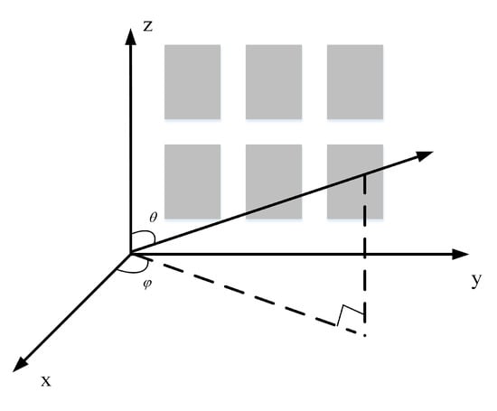 5G systems use Active Antenna System (AAS) antenna technology (3GPP TR 37.842 2017) []. In the study of aggregate interference in the 2.5 GHz band, 5G base stations are configured using beamforming antennas [,]. The purpose of beamforming is to generate directional beams by adjusting the angle and the weight coefficient of each antenna as a way to generate the antenna array gain. The antenna model is shown in Figure 4.