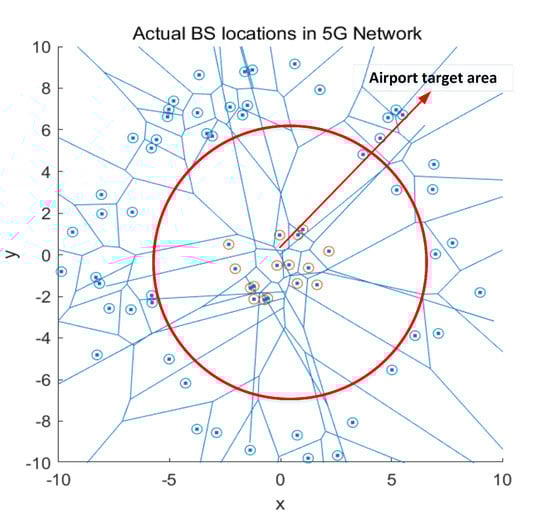 The density of the 5G base stations, distributed around airports, depends on the location of the specific airport and its regulations. In general, this density is high to ensure the quality of communication for the people and equipment on board both the airport and the aircraft. In the literature [], it is stated that the deployment of the actual ground base station is close to the Poisson Point Process (PPP), and the system is modeled using random geometry, distributed over the simulated area using a random generation. The simulation produces a 10 km ×10 km area centred on the airport, as shown in Figure 7. The blue circles show the base stations in the external area of the airport where the cellular cell density is relatively high compared to the airport. In addition, the circled part indicates the airport area and the internal red circles show the internal 5G base stations in the airport. According to the regulations of the 5G base station construction in the airport area, the 5G base stations are mainly concentrated in the airport terminal, the gates, and other areas with high traffic flow and high communication demand; thus, the distribution is relatively concentrated.