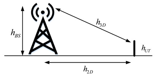 where, f represents the frequency in MHz and d indicates the distance from the aircraft to the receiver in m. The second transmission path is the path loss model according to 3GPP TR 36.873 and ITU-R M.2412 []. The propagation of 5G signals is divided into Urban Macro (UMa) and Rural Macro (RMa) scenarios. Moreover, the transmission schematic is shown in Figure 9. The airport construction environment requires a flat, obstacle-free and wind-stable area to ensure safety during takeoff, landing and flight. Given these comprehensive airport construction considerations, the 5G signals propagation model for the airport field is selected as RMa. In addition, due to the airport’s terminal building, and other building facilities, the signal propagation may be transmitted through reflection, diffraction, and scattering processes to reach the receiver. Therefore, Non-Line Of Sight (NLOS) is selected as the signal transmission method.