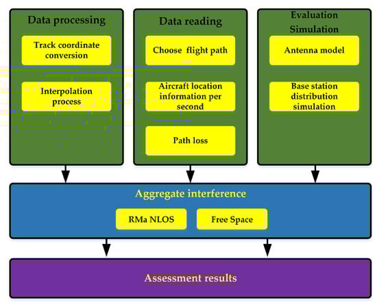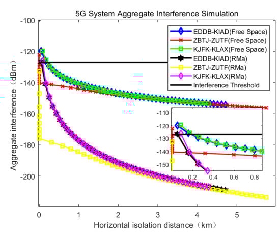 Considering the signal propagation environment, the horizontal isolation distance between both routes without interference effects is approximately 50–180 m, with slightly variations depending on the type of aircraft and the departure airport environment. According to the ICAO runway category A–F, the runway length of civil airports is within the range of 2000–4000 m. Furthermore, airports are constructed with a certain safety spacing to ensure the safety of aircraft during takeoff and taxiing. Before aircraft enter the runway, they need to wait for takeoff instructions on the taxiway. No large base stations can be built within the entire airport site to avoid any adverse impact on the operational safety. Therefore, combined with the above real airport construction environment, the interference between both systems is negligible under the influence of the real airport environment and no additional isolation measures are necessary. To sum up, this simulation method can be analogous to assess interference during the landing phase ensuring that the results maintain their generality.