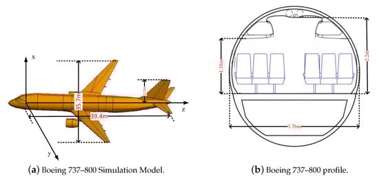 In this paper, geometric modelling is used to simulate the overall airframe architecture of an aircraft. The Boeing 737–800 model is deployed as the carrier for the cruise phase evaluation, and the degree of antenna isolation is utilized as an index to assess the electromagnetic compatibility of airborne systems and to analyze the effect of antenna layout on its isolation degree. The Boeing 737–800 model parameters and profiles are displayed in Figure 13.