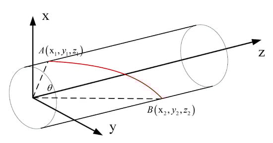 Based on the analysis of the two antenna mounting positions in Section 4.2.1, an equivalent model of the aircraft fuselage is established. Idealizing the aircraft fuselage as a smooth cylindrical surface of pure metal, fixing the position of the onboard RDSS receiving antenna, and adjusting the position of the ATG antenna to move on the cylindrical surface are key factors to obtain the relationship between both antenna positions as shown in Figure 14.