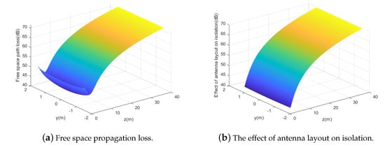 According to the parameter information of Boeing 737–800, the fixed airborne RDSS receiver is located at position coordinates A (3,0,3). By adjusting the ATG antenna to move in the belly part of the aircraft, the relationship between the free space path loss and the antenna isolation concerning the position change between antennas can be derived when the distance between the receiving and transmitting antennas is greater than three meters as shown in Figure 16.