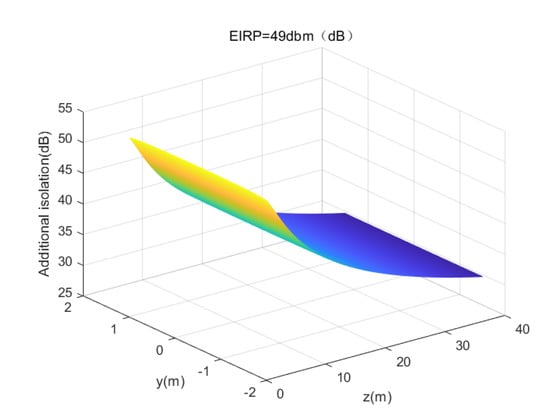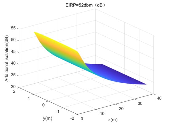 According to BD420007-2015, the maximum acceptable interference power level for RDSS is −127 dBm, where the polarization loss is set at 20 dB, and the feeder loss is equal to 3 dB. From a theoretical point of view, the transmitter power can be very large, refer to Gogo company transmitter, the transmitting power is 49 dBm. Considering the ATG transmitting EIRP of 40 dBm, 49 dBm, and 52 dBm, respectively, simulating the additional isolation required for the two systems antenna compatibility case leads to the results shown in Figure 17, Figure 18 and Figure 19.
