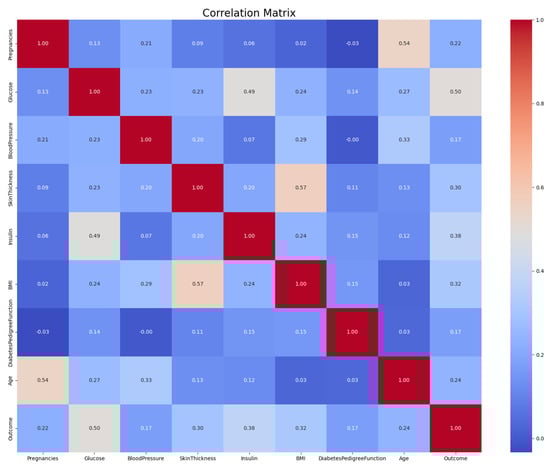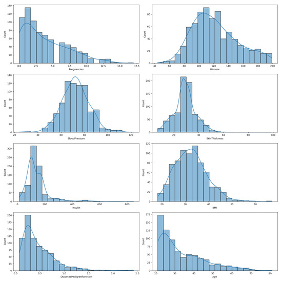Figure 1, we illustrate the distribution of the eight features in the diabetes dataset, enabling a comprehensive understanding of each feature’s variability and distribution. This is an important preliminary step before any further statistical analysis or application of ML algorithms.