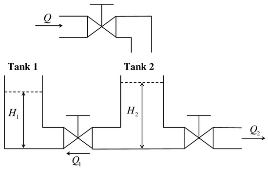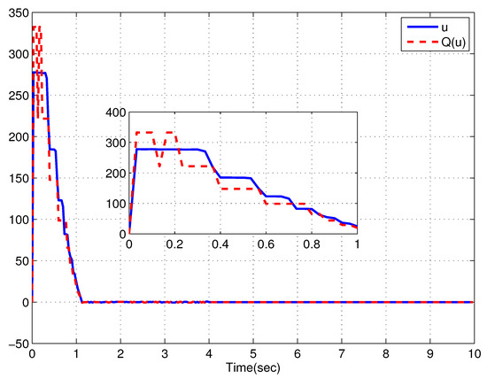 However, prespecifiable settling time is indeed expected by some practice applications, e.g., missile guidance [37]. This fact urges that prescribed/predefined-time control has become an active research topic [34,35,36,37,38,39,40,41]. Especially, drawing support from scaling the state by a function that grows unboundedly toward the terminal time, a computationally singular controller was given for prescribed-time stabilization (PTS) of Brunovsky systems in [42]. The extension of this technique was further refined in [43], where a novel state-scaling transformation (SST) was proposed to overcome the computationally singular problem and provided a solution to the problem of PTS for strict-feedback (switched) nonlinear systems. However, the powers of the studied systems are identically equal to 1 (i.e., ) required in [43], which certainly limits their application because many practical systems are described by PNNSs (refer to the typical example of liquid-level system given in Section 4). Moreover, another common drawback of the aforementioned results is that the effect of the quantized input is ignored.