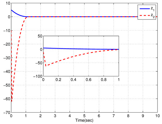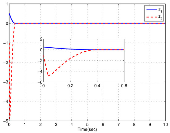 For the simplicity, select the system parameters as , , , , , , and and the prescribed time as s. For different initial conditions (i) , (ii) , Figure 2, Figure 3, Figure 4 and Figure 5 are given to exhibit the responses of the CLS. It can be clearly seen that the convergence time of the system states stays below the prescribed time 4 s in spite of the initial value growing, which confirms the validity of the control scheme. As a result, the simulation results confirm the validity of the control scheme.