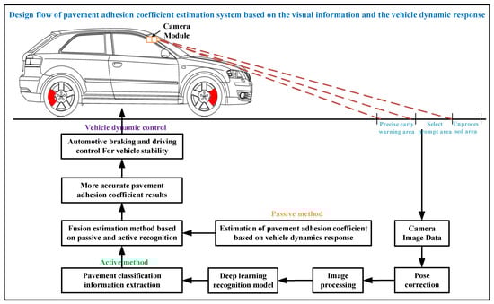 The research in this paper addresses the primary task of designing a roadway adhesion coefficient estimation system, based on visual information and the vehicle’s dynamic response. The design flowchart of the system is shown in Figure 1, above. First, we divide the roadway obtained from the onboard vision sensor into three zones, which comprise the precise warning cueing zone, the selective warning cueing zone, and the unprocessed cueing zone. According to our recognized road ahead prompts for safety warnings, we then load the road surface information obtained by the on-board vision sensor into the domain controller after position correction and image pre-processing, using the deep learning model in this paper to assess the road ahead of the vehicle for the extraction of classification information. Then, based on the dynamic response of the vehicle’s passive estimation of the road surface adhesion coefficient and passive and active recognition using the Fusion estimation method, the fused road surface attachment coefficient estimation will yield more accurate estimation results, so that the stability of the vehicle can be further controlled while also improving driving safety.