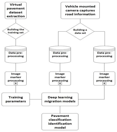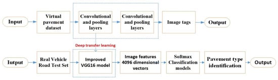 The proposed VGGNet-16 transfer learning-based pavement recognition system takes the approach of obtaining pavement information from the vehicle vision sensors, classifying and recognizing it as follows.