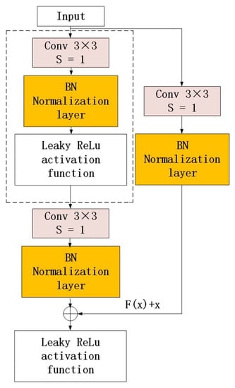 In the original model of the VGGNet-16 network presented in this paper, the residual structure is missing. As the network deepens, the training errors first decrease and then increase; their errors are not due to overfitting but to the difficulty of training due to the deeper layers of the network. In order to solve the above problem, this paper constructs a residual block class containing two convolutional layers, a Leaky ReLU activation function, and a BN algorithm [36] before the activation function to normalize the input data. The residual structure is shown in Figure 4. The convolution and pooling layers in VGGNet-16 can extract the low-level features of the image, while the inclusion of a residual structure can learn higher-level features. The inclusion of the residual structure allows for the learning of higher-level feature representations and is intended to address the impact of gradient disappearance and network depth on learning performance. To some extent, the inclusion of the three residual structures can avoid the loss of features in the convolutional layer when performing image information transfer, and new image features can be learned on the basis of the input features to prevent gradient disappearance due to the deep network layers of VGGNet-16.