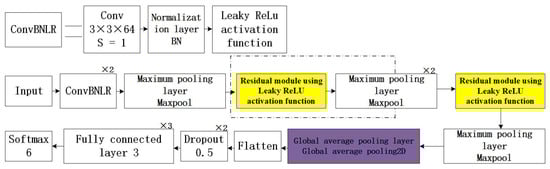 - VGGNet-16 transfer model construction: In this paper, we introduce the Leaky ReLU activation function to replace the ReLU activation function in the original model and fill in the residual structure and dropout inactive layer, etc., to improve the network structure of VGGNet-16 and adjust the parameters. The pre-trained model is then saved from the input layer to the Block4_conv3 layer. The ConvBNLR module consists of a convolutional layer and a normalization layer with a Leaky ReLU activation function, where the convolutional kernel size is set to the feature matrix with a step size of 1. The overall model consists of two ConvBNLR modules, three residual modules, a Maxpooling layer for image size reduction, and a sufficiently connected layer to output three classifications using the Softmax function for classification. The improved VGGNet-16 model reduces the number of parameters in the network model by successive stacks of convolutional kernels with the size of the convolutional kernel, while ensuring the same perceptual field. Then, it increases the number of nonlinear units in the model by adding a residual structure after the VGG module using jump connections, which solves the gradient disappearance and improves the performance of the network’s deep learning. The parameters of the original model of VGGNet-16 are concentrated in the fully connected layer, in order to prevent overfitting, improve the classification accuracy of the pavement, and accelerate the convergence of the network model. After freezing the pre-trained weights, a global average pooling layer, a flattened layer, two dropout inactive layers, and three fully connected layers are added in turn. The input data training set is standardized by uniform size [0.5, 0.5, 0.5] processing, using the Leaky ReLU function after the connection layer and the last classifier using the Softmax function (for the output category of 3 classes of pavement), outputting 3 categories and labeling the categories as 0 for wet asphalt pavement, 1 for dry asphalt pavement, 2 for snow and ice pavement, 3 for concrete pavement output, 4 for gravel pavement output, and 5 for jointed pavement output. The modified VGGNet-16 network model and the technical flow of this research paper are shown in Figure 5.