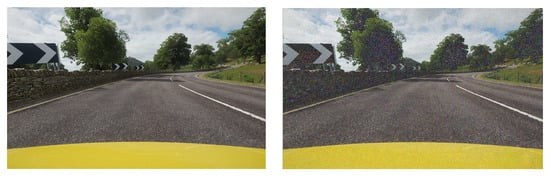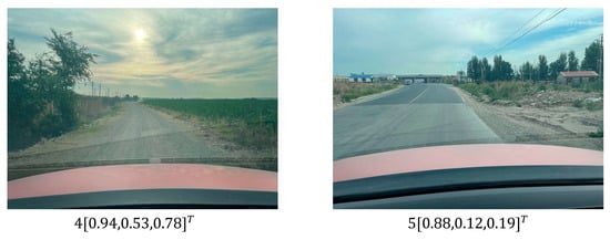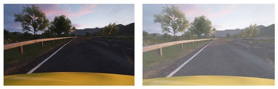 Due to the large size and complex calculation cost of the training dataset required to obtain the vehicle dynamics model, we used a virtual road dataset using high-fidelity data image acquisition. The acquired dataset was enhanced with random inversion, random cropping, random mirroring, and the two-dimensional gamma function proposed in the literature [37], to complete the description of the uniformity calibration process and Gaussian distribution noise [38] on the road dataset. The data preprocessing description and validation set are shown in Table 2. In the image preprocessing stage, the virtual pavement dataset was acquired for random mirroring, cropping, and filling. However, in the dataset, the pavement’s state was obscured by some tree guard rails, causing the created dataset to have color shading, which made the different pavement states appear to have similar features and made the convolutional neural network training model much more difficult; therefore, we must perform a calibration process on these datasets. We used the two-dimensional gamma function proposed in the above literature to complete the uniform mapping of the road surface dataset and, finally, used the optimized network structure to classify and output the classes to which the different pavement states belonged. Figure 7 shows the effect of the processed image.