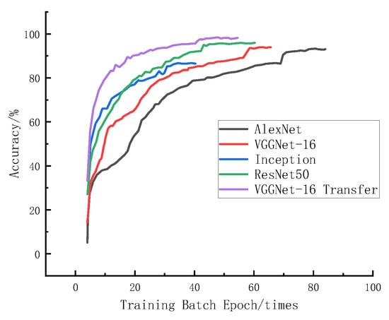 In order to further validate the accuracy and recognition of the proposed combined transfer learning and improved VGGNet-16 model for pavement classification presented in this paper, it was compared with four other classical network models under the same test conditions, as well as the training loss curve of the improved VGGNet-16 model. In this paper, as can be seen from Figure 10 and Figure 11, the accuracy curve of the VGGNet-16 transfer learning model (VGGNet-16 transfer) converged after about 45 epochs, con-verging faster among the models compared and allowing less time to train a better model. The loss curve of the model reached 0.4 after 100 epochs and the LOSS curve steadily decreased as the number of training batches increased. In this paper, the dropout layer was added to the model improvement, and the curves show that the improved VGGNet-16 model curve was relatively stable.