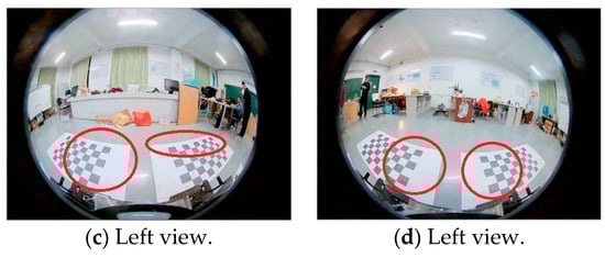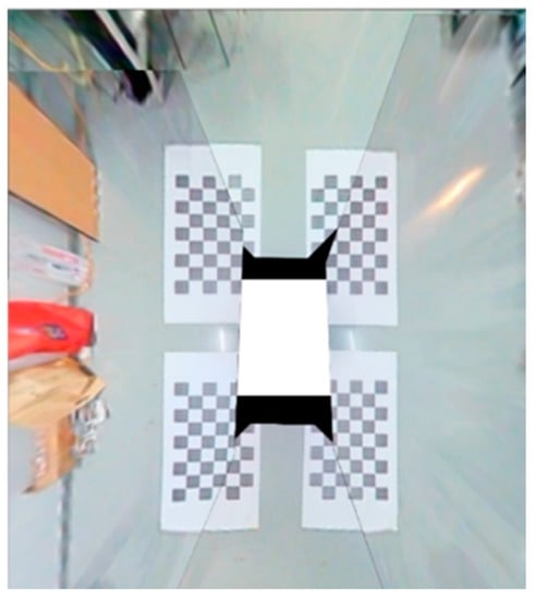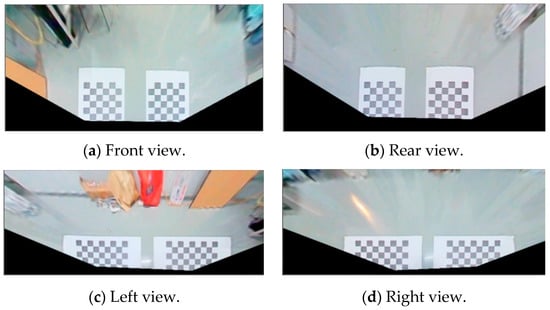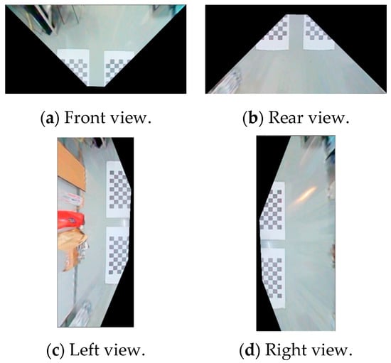 The projection matrices of the four cameras are not independent of one another, but to ensure that the projection points are positioned exactly in correspondence, we place the markers around the vehicle, acquire the images, manually select the corresponding points, and then obtain the projection matrix to achieve the next step of the top-view stitching. The projected transformed image is shown in Figure 4.