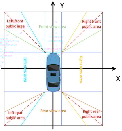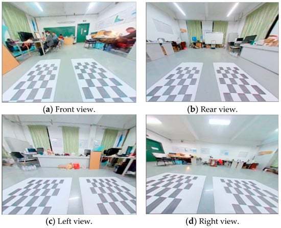 In image stitching, the image common point matching method cannot meet the demand for real-time operation due to its large computational volume []. In contrast, the stitching method based on a unified coordinate system can achieve fast real-time processing while ensuring accuracy. To stitch the four images together, a unified stitching coordinate system must be established first. The y-axis in Figure 5 indicates the ground projection corresponding to the line where the front and rear cameras are located, and the x-axis indicates the ground projection corresponding to the line where the left and right rear-view mirrors are located.