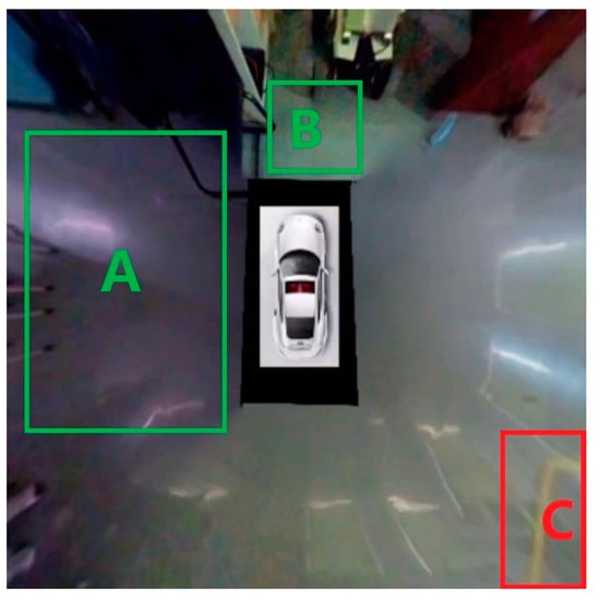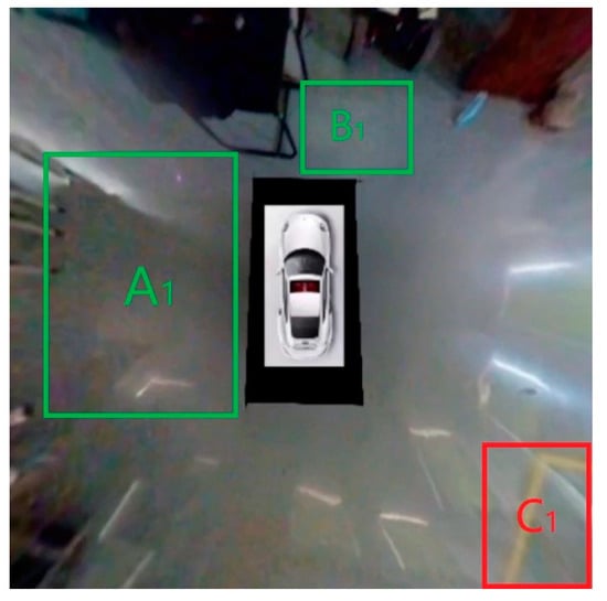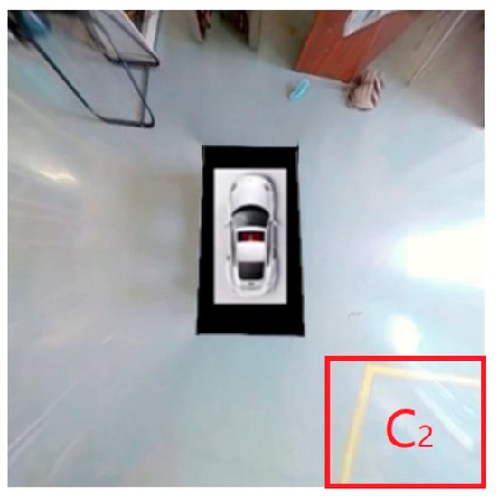 where indicates the adjusted brightness coefficients of the B, G, and R channels in the front-view area, and , , and are the adjusted brightness coefficients of the rear-view area, left-view area, and right-view area, respectively. The coefficient x denotes the unadjusted equalization factor, i.e., , , and in Equations (7)–(10), and the coefficient X denotes the adjusted equalization factor, i.e., , , , and in Equations (12)–(15), which is improved in this paper. The purpose of introducing the equalization adjustment coefficients is to darken the overly bright channels, so that the multiplication factor is less than 1, and the overly dark channels are brightened, so that the multiplication factor is greater than 1. Figure 11 shows the panoramic fusion of the improved image equalization process. C2 denotes the parking area obtained by the improved processing.