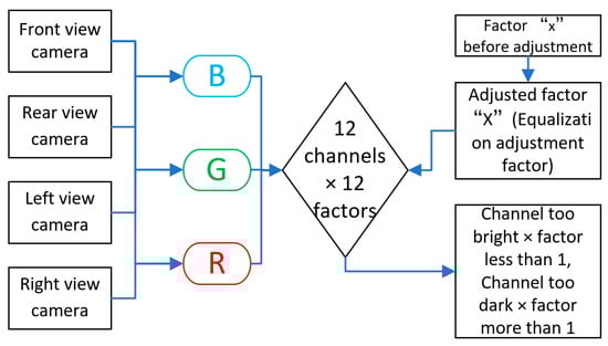Each camera returns three channels of B, G, R, and the four cameras return a total of 12 channels. In order to perform equalization fusion, 12 adjustment coefficients are introduced; these coefficients are applied to the 12 channels, each channel is adjusted by multiplying them together, and finally the adjusted channels are combined to form the equalized fused picture. The adjustment coefficients are shown in the following equations: