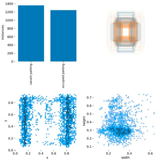 Before conducting the training, the 1350 produced samples were randomly divided at a ratio of 7:3; 954 samples constituted the training set for training the model, and the remaining 396 samples constituted the validation set for verifying the effect of the model after training. The 1350 samples included a total of about 10,000 manually labeled instances in different scenarios, with two categories of empty and occupied parking spaces, labeled as vacant parking and occupied parking, respectively. The information statistics of the dataset are shown in Figure 12.