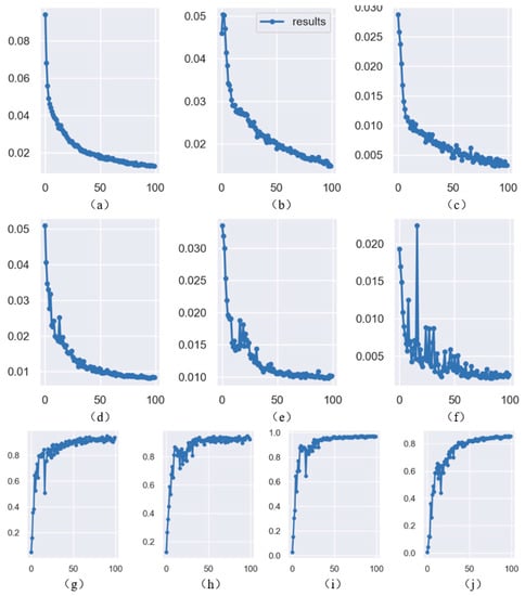 Model evaluation results. (a) Training set localization loss function (b) Training set target confidence loss function (c) Training set class loss function (d) Verification set localization loss function (e) Verification set target confidence loss function (f) Verification set class loss function (g) Accuracy curve (h) Recall rate curve (i) mAP@0.5 curve (j) mAP@0.5:0.95 curve.