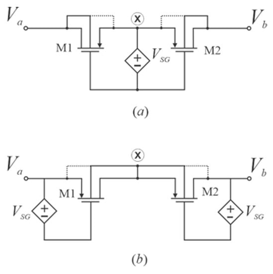 The bulk connection of M1 and M2 in Figure 2b play an important role in the P-R performance. In order to analyze the behavior, half of the P-R in Figure 2b can be considered for simplicity. Thus, M1a with bulk-drain connected as depicted in Figure 5a and M1b with bulk-source connected as in Figure 5b were analyzed. In both cases, Va = VS. For the first case (Figure 5a), VBD = 0; VBS = −VS, and VBG = VSG − VS; these conditions in Equation (1) bring the following expression: