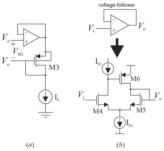 The proposed P-R followed the topology from Figure 2b with the bulks connected to node “x”; the controlled bias voltage sources were implemented following the scheme in Figure 4a. This topology allows for controlling each PMOS transistor of the P-R setting VSG potential independently. For the implementation of this controlled bias voltage source, we proposed the use of a compact voltage follower based on the differential flipped voltage follower (DFVF) [13,14], which is insensitive to the bulk-effect. The voltage follower schematic is depicted in Figure 4b; its output resistance is given by 1/gm6(gm4ro), which is small enough to provide the bias current required by Ib current source (Figure 4a). This circuit presents a high input resistance for the P-R terminal Va and allows PMOS transistors M1 and M2 (Figure 2b), and M3 (Figure 4a) to be properly matched to reduce process parameter variations. The transdiode configuration implemented by M3 is also considered for the implementation of VSG; the bulk-source short-circuit avoids the unwanted bulk-effect in M3, offering a VSG constant over the P-R dynamic range.