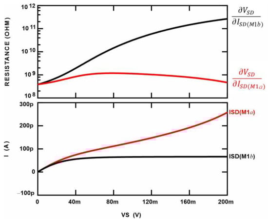 Simulated drain current and the dynamic resistance ∂VSD/∂ISD of both half-circuits (Figure 5) are plotted in Figure 7; these resulted from a DC sweep of VS from 0 to 0.2 V and VSG = 0.3 V. As expected, both drain currents followed the behavior of Equations (2) and (3), where the drain current of M1a was more significant than M1b due to the bulk connection resulting in less resistance. However, the dynamic resistance of M1b changed much more in the VS range than M1a; consequently, this configuration presented much less variability in its effective resistance.